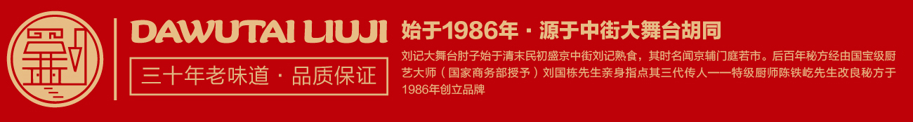 品牌創(chuàng)始人陳鐵屹先生自幼師承遼菜正宗,以發(fā)揚(yáng)傳承遼味為己任。1986年,陳鐵屹先生經(jīng)師傅指導(dǎo)調(diào)制出第一鍋醬湯,自此開始制作熟食,并于市井銷售,食客絡(luò)繹不絕。作為中華美食的傳承者、開拓者和創(chuàng)新者,陳鐵屹先生于80年代創(chuàng)立“劉記大舞臺肘子”品牌,開出了第一家門店?;诎倌昝胤絺鞒懈牧?,并采用新鮮放心原料,秘用二十幾味名貴藥材,延用傳統(tǒng)工藝專心加工而成,形成了色澤艷麗,酥爛脫骨,肥而不膩,瘦而不柴的風(fēng)味產(chǎn)品。